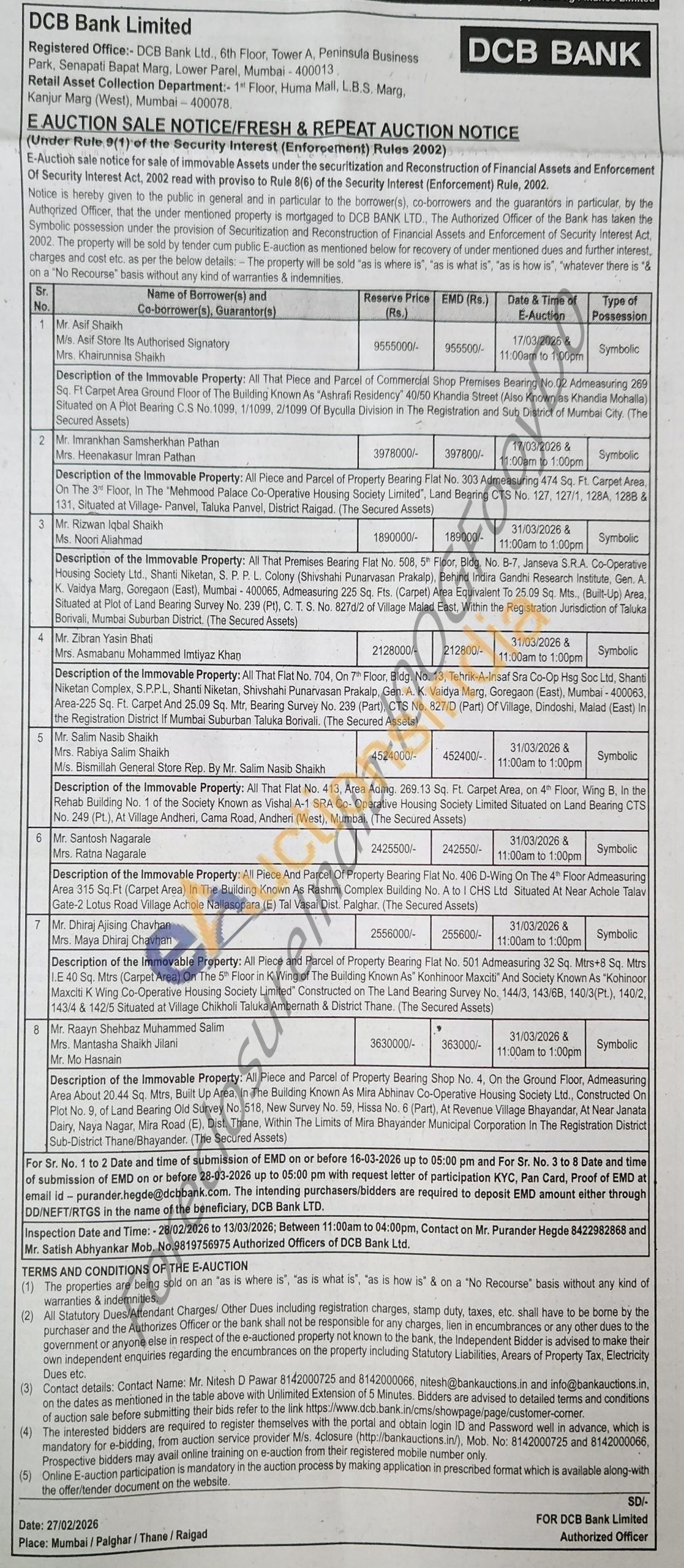 All That Flat No. 413, Area Admg. 269.13 Sq. Ft. Carpet Area, on 4th Floor, Wing B, In the Rehab Building No. 1 of the Society Known as Vishal A-1 SRA Co-Operative Housing Society Limited Situated on Land Bearing CTS No. 249 (Pt.), At Village Andheri, Cama Road, Andheri (West), Mumbai, (The Secured Assets)