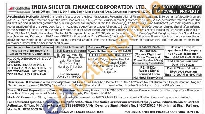 Place Of Emd Deposition / Place Of Auction: Mr. Vinay Rana, (+91-7988605030, Above Canara Bank, 3rd Floor, Opp. Dak Banglow, Near Bus Stand, Ajmer road, Madanganj, Kishangarh, Dist Ajmer -305801