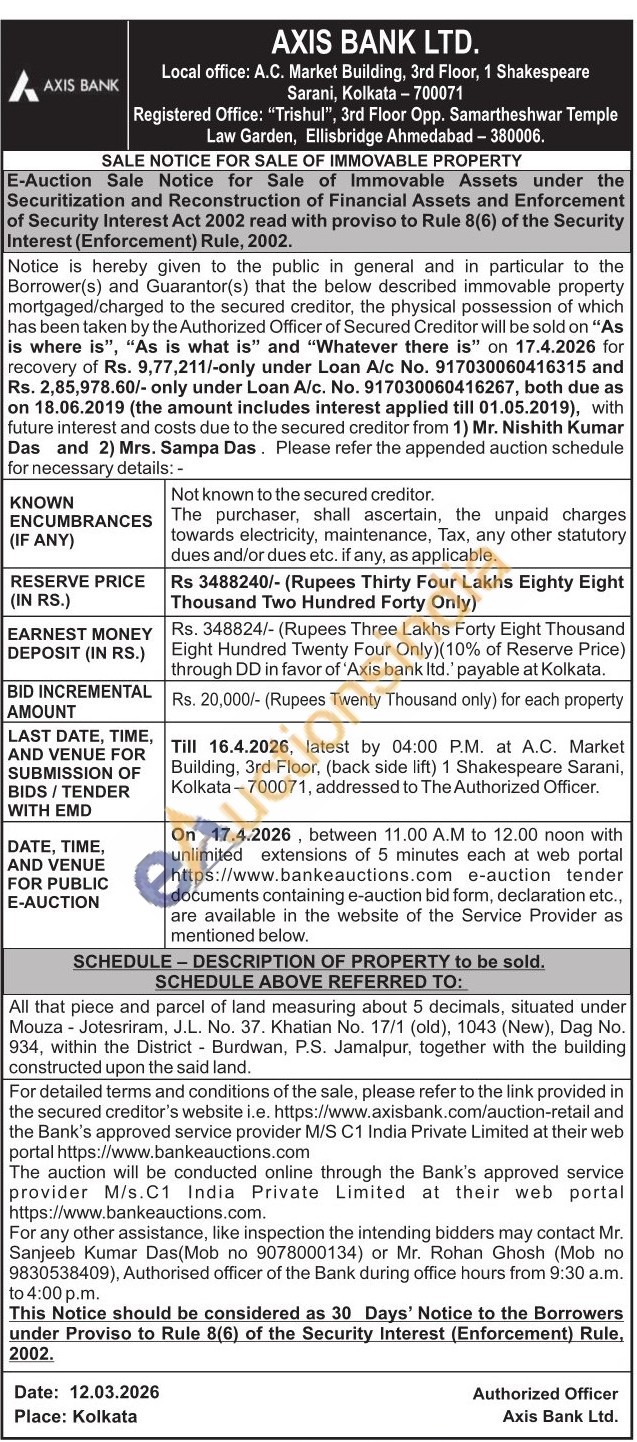 All that piece and parcel of land measuring about 5 decimals, situated under Mouza Jotesriram, J.L. No. 37. Khatian No. 17/1 (old), 1043 (New), Dag No. 934, within the District Burdwan, P.S. Jamalpur, together with the building constructed upon the said land