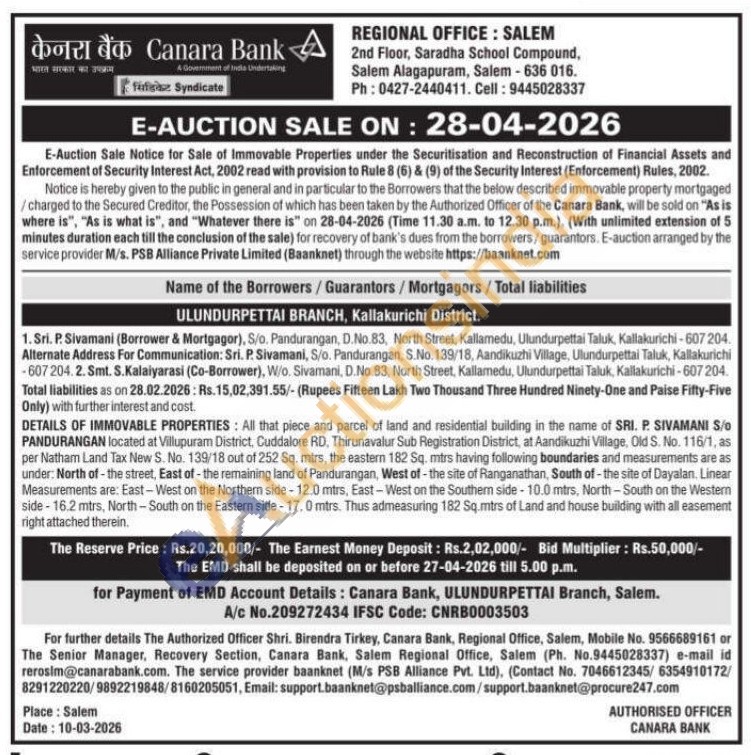 DETAILS OF IMMOVABLE PROPERTIES: All that piece and parcel of land and residential building in the name of SRI. P. SIVAMANI S/o PANDURANGAN located at Villupuram District, Cuddalore RD, Thirunavalur Sub Registration District, at Aandikuzhi Village, Old S. No. 116/1, as per Natham Land Tax New S. No. 139/18 out of 252 Sq. mtrs, the eastern 182 Sq. mtrs having following boundaries and measurements are as under: North of the street, East of the remaining land of Pandurangan, West of the site of Ranganathan, South of the site of Dayalan. Linear Measurements are: East-West on the Northern side-12.0 mtrs, East-West on the Southern side-10.0 mtrs, North-South on the Western side-16.2 mtrs, North-South on the Eastern side-17.0 mtrs. Thus admeasuring 182 Sq.mtrs of Land and house building with all easement right attached therein.