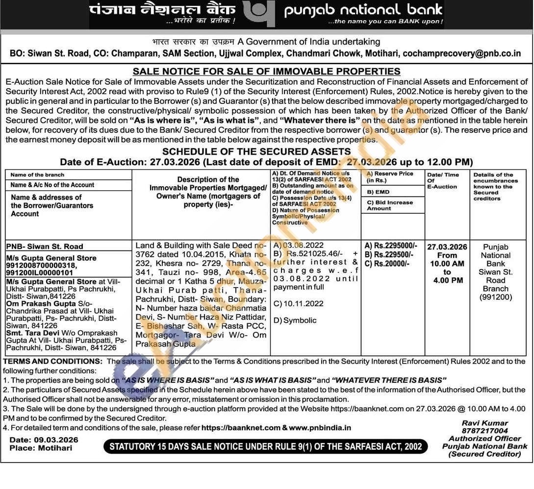 Land & Building with Sale Deed no-3762 dated 10.04.2015, Khata no-232, Khesra no- 2729, Thana no- 341, Tauzi no- 998, Area-4.65 decimal or 1 Katha 5 dhur, Mauza-Ukhai Purab patti, Thana no-Pachrukhi, Distt- Siwan, Boundary: N- Number haza baidar Chanmatia Devi, S- Number Haza Niz Pattidar, E- Bisheshar Sah, W- Rasta PCC, Mortgagor- Tara Devi W/o- Om Prakasah Gupta