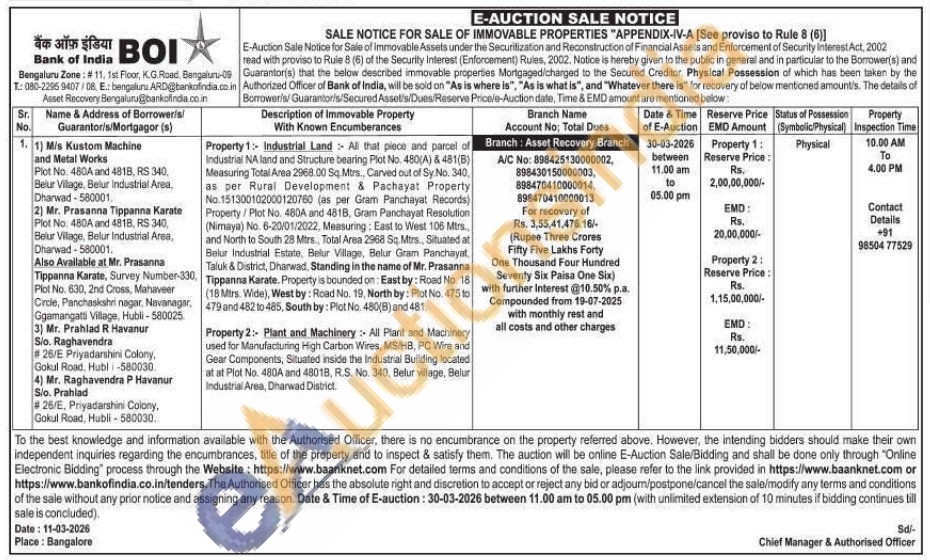 Property 1:- Industrial Land: All that piece and parcel of Industrial NA land and Structure bearing Plot No. 480(A) & 481(B) Measuring Total Area 2968.00 Sq Mtrs., Carved out of Sy. No. 340, as per Rural Development & Pachayat Property No. 151300102000120760 (as per Gram Panchayat Records) Property/Plot No. 480A and 481B, Gram Panchayat Resolution (Nimaya) No. 6-20/01/2022, Measuring: East to West 106 Mtrs, and North to South 28 Mtrs., Total Area 2968 Sq.Mtrs., Situated at Belur Industrial Estate, Belur Village, Belur Gram Panchayat Taluk & District, Dharwad, Standing in the name of Mr. Prasanna Tippanna Karate. Property is bounded on: East by: Road No. 18 (18 Mtrs. Wide), West by: Road No. 19, North by: Plot No. 475 to 479 and 482 to 485, South by: Plot No. 480(B) and 481.