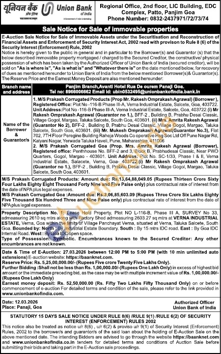 Property Description No. 1: Lease Hold Property, Plot NO L-116-B, Phase III A, SURVEY No 33, admeasuring 2610 sq mirs along with Factory Shed admeasuring 2603.27 sq mirs at VERNA INDUSTRIAL ESTATE, Verna, Goa within the limits of Village Panchayat Verna, situated at Verna, Taluka Salcete, South Goa. Bounded by: North: By Industrial Estate Boundary. South: By 15 mtrs IDC road. East: By Goa IDC Intemal Road. West: By Goa IDC open space