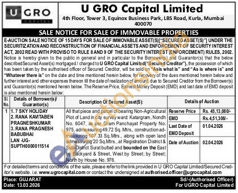 All that piece and parcel of bearing Non-Agricultural Plot of Land in city survey ward: Katargram, Nondh No. 6047, as per Gram Panchayat Property No. 975, admeasuring 49.72 Sq. Mtrs., construction ad-measuring 107.33 Sq.Mirs., along with open land admeasuring 20 Sq.Mirs., at Registration District & Sub-District Surat butted and bounded on the East by Backyard & Street, West by Street, by Street, North by House No. 976