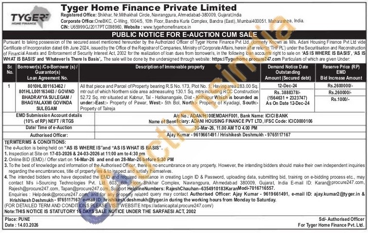All that piece and Parcel of Property bearing R.S No. 173, Plot No. 1, Having area 283.00 Sq. mtr out of which Northern side area admeasuring 130.1 Sq. mtrs including RCC Construction 52.72 Sq. mtr situated at Kabnur, Tal - Hatkanangale, Dist-Kolhapur Which is bounded as under:-East:- Property of Pawar, West:- 5th Bol, North: Property of Kyadagi, South:-Property of Talreja