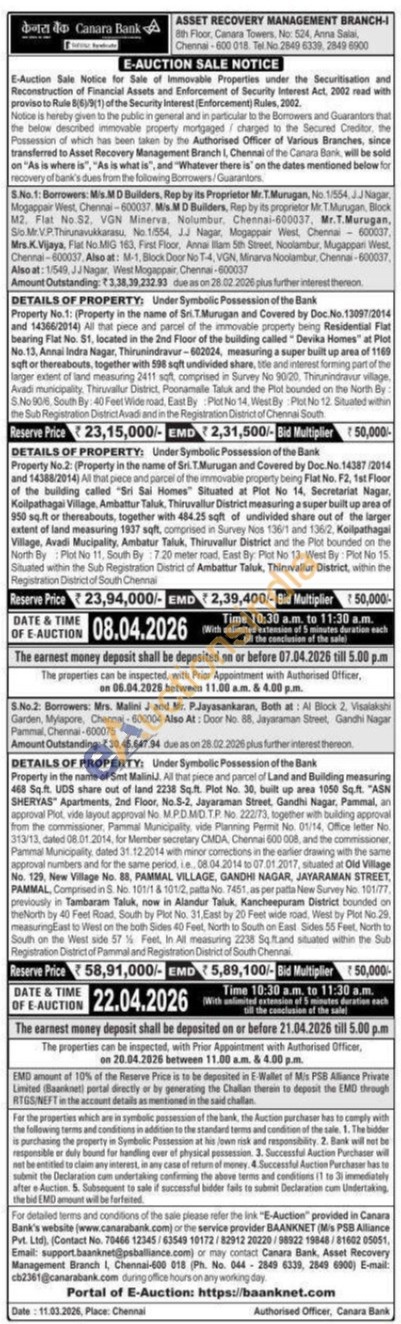DETAILS OF PROPERTY: Under Symbolic Possession of the Bank Property No.1: (Property in the name of Sri.T.Murugan and Covered by Doc.No. 13097/2014 and 14366/2014) All that piece and parcel of the immovable property being Residential Flat bearing Flat No. 51, located in the 2nd Floor of the building called Devika Homes" at Plot No. 13, Annai Indra Nagar, Thirunindravur-602024, measuring a super built up area of 1169 soft or thereabouts, together with 598 sqft undivided share, the and interest forming part of the larger extent of land measuring 2411 soft, comprised in Survey No 9020, Thiunindravur village. Avadi municipality. Thiruvallur District, Poonamalle Tatuk and the Plot bounded on the North By S.No 9016 South By: 40 Feet Wide mat, East By: Plot No 14, West By Plot No 12. Situated within the Sub Registration District Avadi and in the Registration District of Chennai South