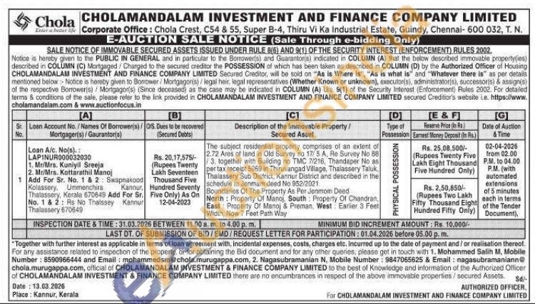 The subject residential property comprises of an extent of 2.72 Ares of land in Old Survey no 17/5 A, Re Survey No 88 /3, together with Building no TMC 7/216, Thandaper No as per tax receipt 5969 in Thiruvangad Village, Thalassery Taluk Thalassery Sub District, Kannur District and described in the to Jenmam deed No 952/2021 Boundanes Of The Property As Per Jenmom Deed North: Property Of Manoj, South: Property Of Chandran East Property Of Manoj & Preman, West: Earlier 3 Feet Width, Now 7 Feet Path Way