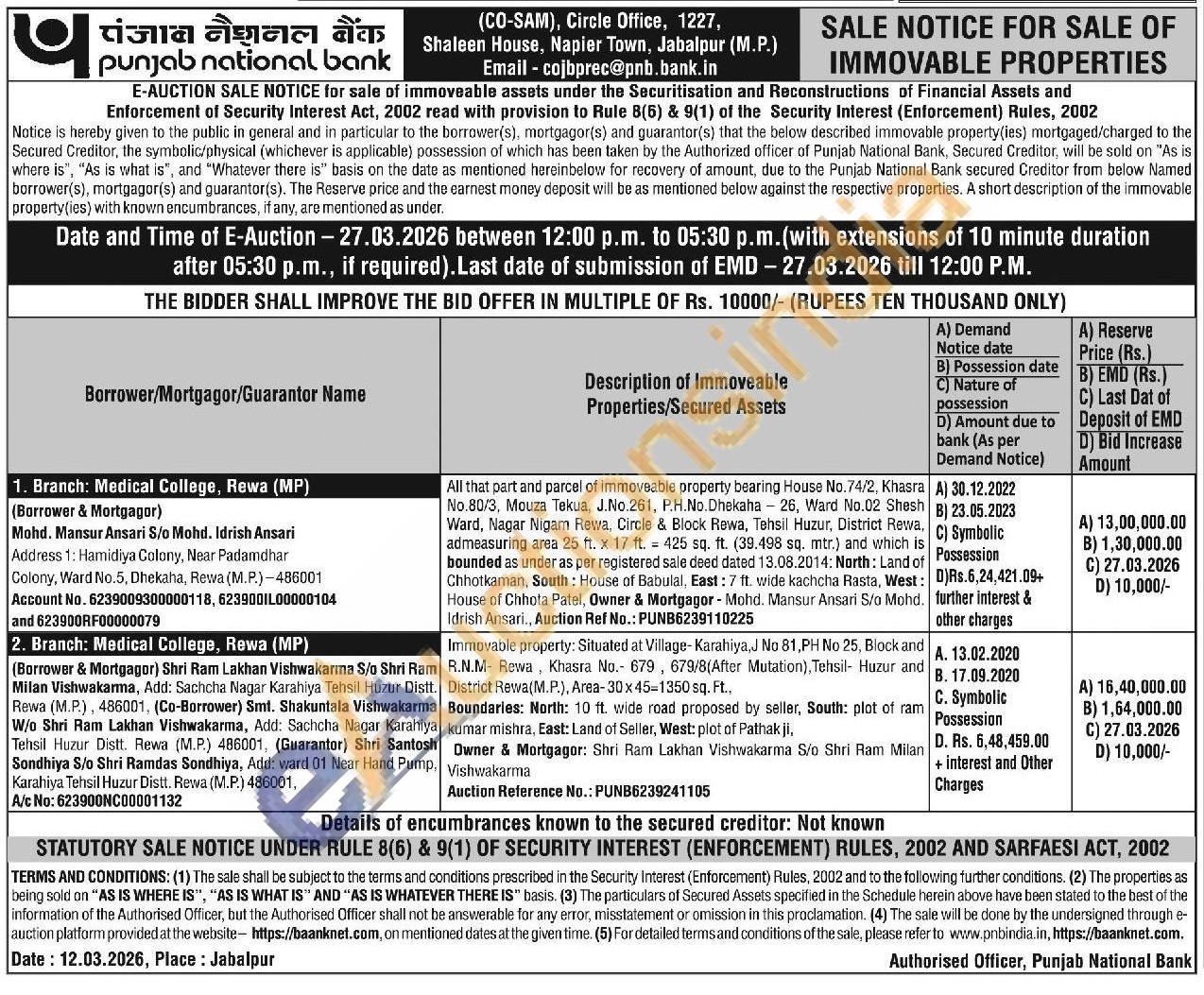 All that part and parcel of immoveable property bearing House No.74/2, Khasra No.80/3, Mouza Tekua, J.No.261, P.H.No. Dhekaha 26, Ward No.02 Shesh Ward, Nagar Nigam Rewa, Circle & Block Rewa, Tehsil Huzur, District Rewa. admeasuring area 25 ft. x 17 ft. 425 sq. ft. (39.498 sq. mtr.) and which is. bounded as under as per registered sale deed dated 13.08.2014: North: Land of Chhotkaman, South: House of Babulal. East: 7 ft. wide kachcha Rasta, West: House of Chhota Patel, Owner & Mortgagor - Mohd. Mansur Ansari S/o Mohd. Idrish Ansari., Auction Ref No.: PUNB6239110225