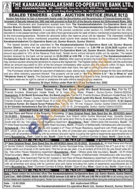 All that Piece and Parcel of the Property Consisting: 1 Item Original Regd. Sale Deed Doc No. 6518/2023 dated 10-10-2023: Schedule A: Guntur District, Koretipadu Sub District within Guntur Municipal Area, Gorantla Grama D.No 471, out of Ac 11-33 Cents within out of acres 2-00 cents land, Plot no 24 as per plan, it is an extent of 619-233 Sq. yds South side 501 Sq. Yds within Pavan Residency Apartment. Boundaries: East: Others plots Site boundary, South: 33 Ft Wide Road boundary, West: 33 Ft Wide Road boundary, North: Property of Bethamsetty Venkateswarlu site boundary. Schedule-B: One Apartment Flat No.403 located in 4th Floor of Pavan Residency Apartment with Plinth area of 1250 SFT, which got an extent of 40 Sq Yds or 33.44 Sq. Mtrs of Undivided and unspecified share out of 501 Sq yds and along with all amenities and along with its common and joint rights including the rights of easements appurtenants etc is being Bounded by: East: Open to sky, South: Open to sky, West: Common Corridor & Steps, North: Open to sky
