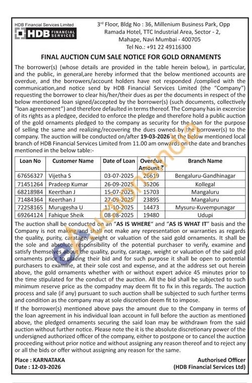 HDB Financial Services Limited Gold Auctions Auction in Bengaluru