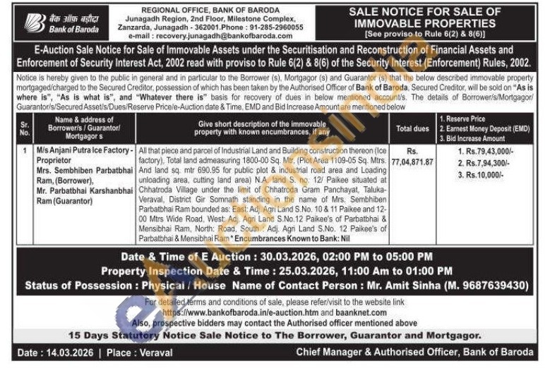- All that piece and parcel of Industrial Land and Building construction thereon (Ice factory), Total land admeasuring 1800-00 Sq. Mtr, (Plot Area 1109-05 Sq. Mtrs. And land sq. mtr 690.95 for public plot & industrial road area and Loading unloading area, cutting land area) N.A. land S. no. 12/ Paikee situated at Chhatroda Village under the limit of Chhatroda Gram Panchayat, Taluka-Veraval, District Gir Somnath standing in the name of Mrs. Sembhiben Parbatbhai Ram bounded as: East: Adj. Agri Land S.No. 10 & 11 Paikee and 12-00 Mtrs Wide Road, West: Adj. Agri Land S.No. 12 Paikee's of Parbatbhai & Mensibhai Ram, North: Road, South Adj. Agri Land S.No. 12 Paikee's of Parbatbhai & Mensibhai Ram Encumbrances Known to Bank: Nil