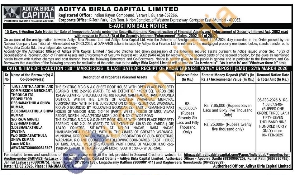 THE EXISTING R.C.C & A.C SHEET ROOF HOUSE WITH OPEN PLACE PROPERTY BEARING H.NO 2-2-196 (PART), TO AN EXTENT OF 149.50 SQ. YARDS (OR) 124.99 SQ.MTRS, SITUATED AT NEHRU NAGAR, NAIM NAGAR, HANUMAKONDA DISTRICT, WITHIN THE LIMITS OF GREATER WARANGAL MUNCIPAL CORPORATION, WITH IN THE JURISDICATION OF SUB-REGISTRAR, WARANGAL R.O AND BOUNDED BY FOLLOWING BOUNDARIES: EAST: REMAINING PART HOUSE OF VENDOR H.NO. 2-2-196 (PART), WEST HOUSE OF MRS. VIJAYA REDDY, NORTH: NALA(PEDDA MORI), SOUTH: 30'-0" WIDE ROAD THE EXISTING R.C.C & A.C SHEET ROOF HOUSE WITH OPEN PLACE PROPERTY BEARING H.NO 2-2-196 (PART) TO AN EXTENT OF 149.50 SQ. YARDS (OR) 124.99 SQ.MTRS, SITUATED AT NEHRU NAGAR, NAIM NAGAR, HANUMAKONDA DISTRICT, WITH IN THE LIMITS OF GREATER WARANGAL MUNCIPAL CORPORATION, WITH IN THE JURISDICATION OF SUB-REGISTRAR, WARANGAL R.O AND BOUNDED BY FOLLOWING BOUNDARIES: EAST: HOUSE OF MRS. ANJALI, WEST: REMAINING PART HOUSE OF VENDOR H.NO -2-2-196(PART), NORTH: NALA (PEDDA MORI), SOUTH: 30'-0- WIDE ROAD