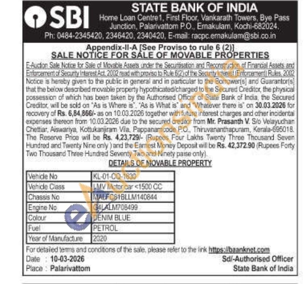 Contact no : 0484-2345420, 2346420, 2340420, E-mail: racpc.emakulam@sbi.co.in