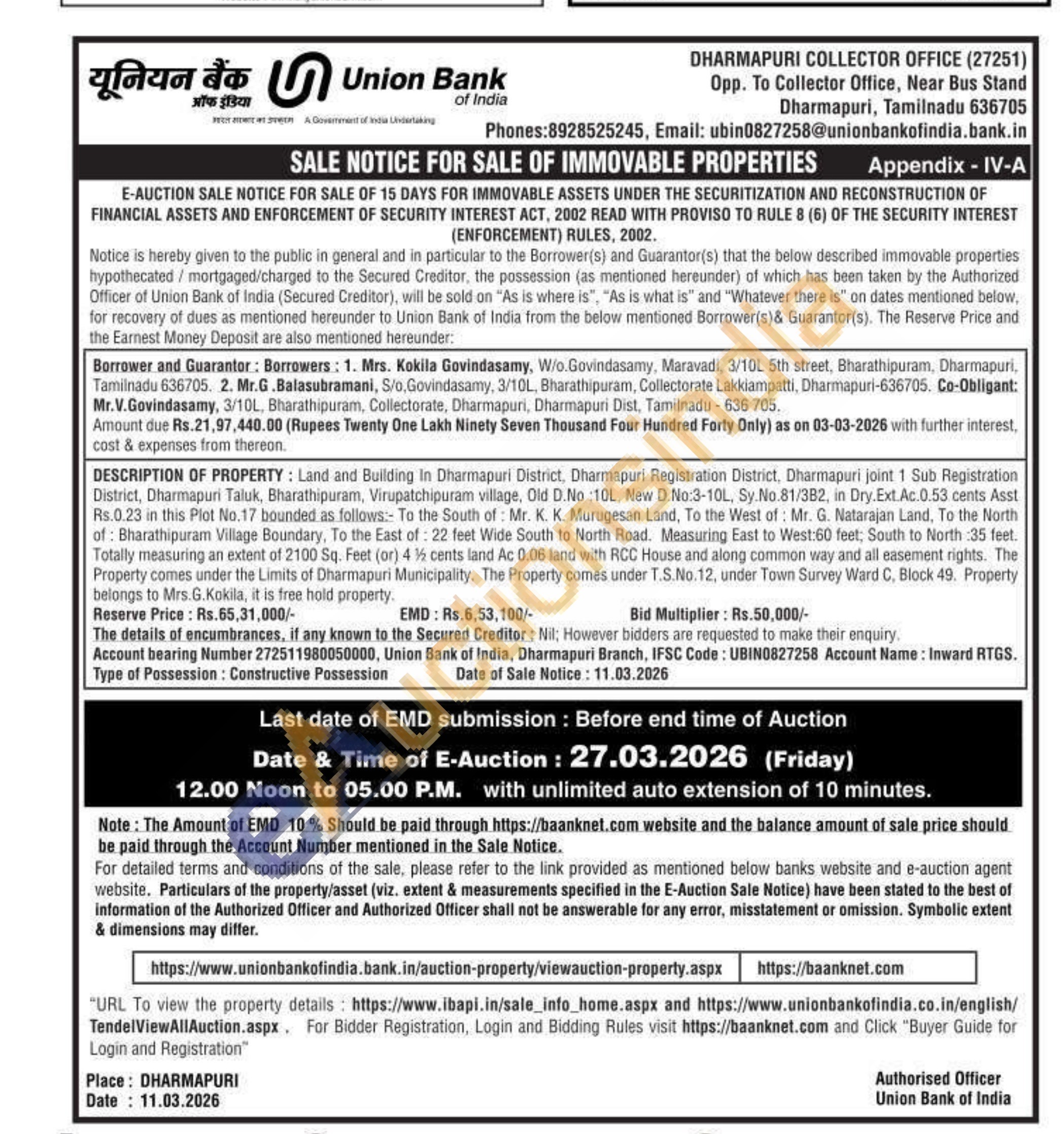 DESCRIPTION OF PROPERTY: Land and Building In Dharmapuri District, Dharmapuri Registration District, Dharmapuri joint 1 Sub Registration District, Dharmapuri Taluk, Bharathipuram, Virupatchipuram village, Old D.No:10L, New D.No:3-10L, Sy.No.81/3B2, in Dry.Ext.Ac.0.53 cents Asst Rs.0.23 in this Plot No.17 bounded as follows:- To the South of Mr. K. K. Murugesan Land, To the West of: Mr. G. Natarajan Land, To the North of: Bharathipuram Village Boundary, To the East of: 22 feet Wide South to North Road. Measuring East to West:60 feet, South to North :35 feet. Totally measuring an extent of 2100 Sq. Feet (or) 4½ cents land Ac 0.06 land with RCC House and along common way and all easement rights. The Property comes under the Limits of Dharmapuri Municipality. The Property comes under T.S.No.12, under Town Survey Ward C, Block 49. Property belongs to Mrs.G.Kokila, it is free hold property