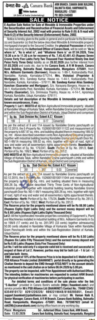 Lot 2: All the hypothecated movable properties consisting of Equipment's, Plant and Machineries installed in industrial building of M/s. Adilaxmi Garments in Sy no 199/8 (17 cents) and Sy no. 281/3P2 (33 cents) together admeasuring 50.00 cents situated in Nandalike Village of Karkarala Taluk within Nandalike Gram Panchayath limits and within the Sub-Registration District of Karkala, Udupi District