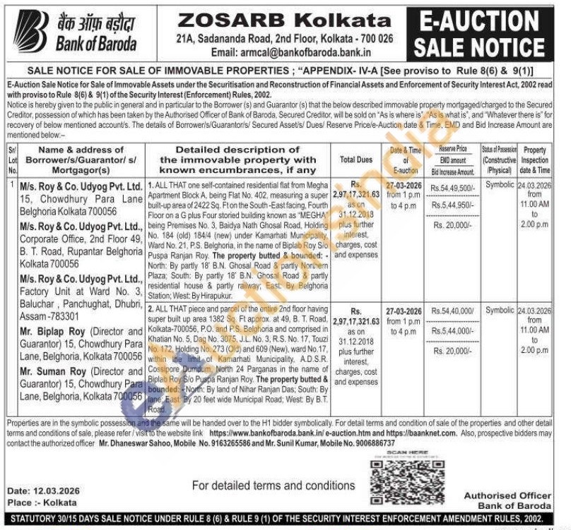 2. ALL THAT piece and parcel of the entire 2nd floor having super built up area 1382 Sq. Ft approx. at 49, B. T. Road. Kolkata-700056, P.O. and P.S. Belghoria and comprised in Khatian No. 5, Dag No. 3075, J.L. No. 3, R.S. No. 17, Touzi No. 172, Holding No. 273 (Old) and 609 (New), ward No. 17. within the limit of Kamarhati Municipality, AD.S.R. Cossipore Dumdum, North 24 Parganas in the name of Biplab Roy S/o Puspa Ranjan Roy. The property butted & bounded: North: By land of Nihar Ranjan Das; South: By lane: East: By 20 feet wide Municipal Road; West. By B.T. Road.