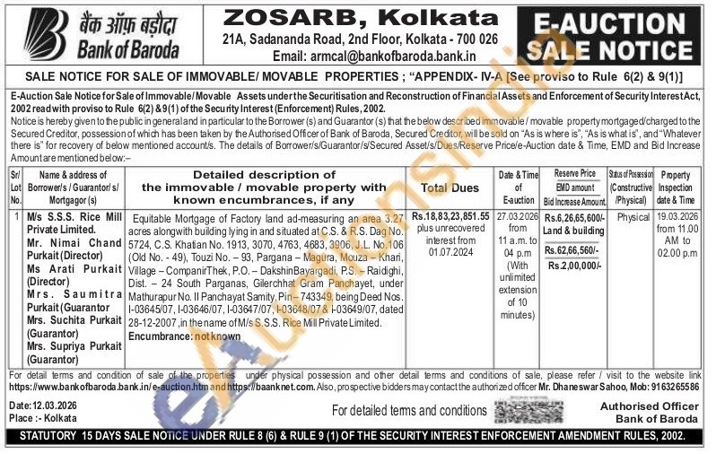 Equitable Mortgage of Factory land ad-measuring an area 3.27 acres alongwith building lying in and situated at C.S. & R.S. Dag No. 5724, C.S. Khatian No. 1913, 3070, 4763, 4683, 3906, J.L. No. 106 (Old No. -49), Touzi No. 93, Pargana Magura, Mouza - Khari, Village Companir Thek, P.O. - Dakshin Bayargadi, P.S. Raidighi, Dist. 24 South Parganas, Gilerchhat Gram Panchayet, under Mathurapur No. II Panchayat Samity, Pin-743349, being Deed Nos. 1-03645/07, 1-03646/07, 1-03647/07, 1-03648/07 & 1-03649/07, dated 28-12-2007, in the name of M/s S.S.S. Rice Mill Private Limited.