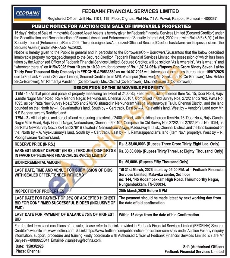 ITEM-1-All that piece and parcel of property measuring an extent of 2400 Sq. Feet, with building thereon Item No. 15, Door No.3, Rajiv Gandhi Nagar Main Road, Rajiv Gandhi Nagar, Nerkundram, Chennai 600107, Comprised in Old Survey Nos. 272/2 and 278/2, Patta No. 1095, as per Patta New Survey Nos.272/5 and 278/1C situated in Nerkundram Village, Maduravoyal Taluk, Chennai District, and the land bounded on the: North by I. Savarimuthu's land, South by - Cart track, East by - A. Kalavathi's land, West by - Vendor's Land now Mr. N.S.Bangaruswamy Reddiar Land ITEM-2-All that piece and parcel of land measuring an extent of 2400 sq.feet, with building thereon Item No. 16, Door No.4, Rajiv Gandhi Nagar Main Road, Rajiv Gandhi Nagar, Nerkundram, Chennai-600107, Comprised in Old Survey Nos. 272/2 and 278/2, Patta No. 1094, as per Patta New Survey Nos. 272/4 and 278/1B situated in Nerkundram Village, Maduravoyal Taluk, Chennai District, and the land bounded on the: North by - A. Viyakulamary's land, South by Cart track, East by - T. Ramarajapandian's land (Item No.1 property), West by - R. Poongavanam Naicker's land,