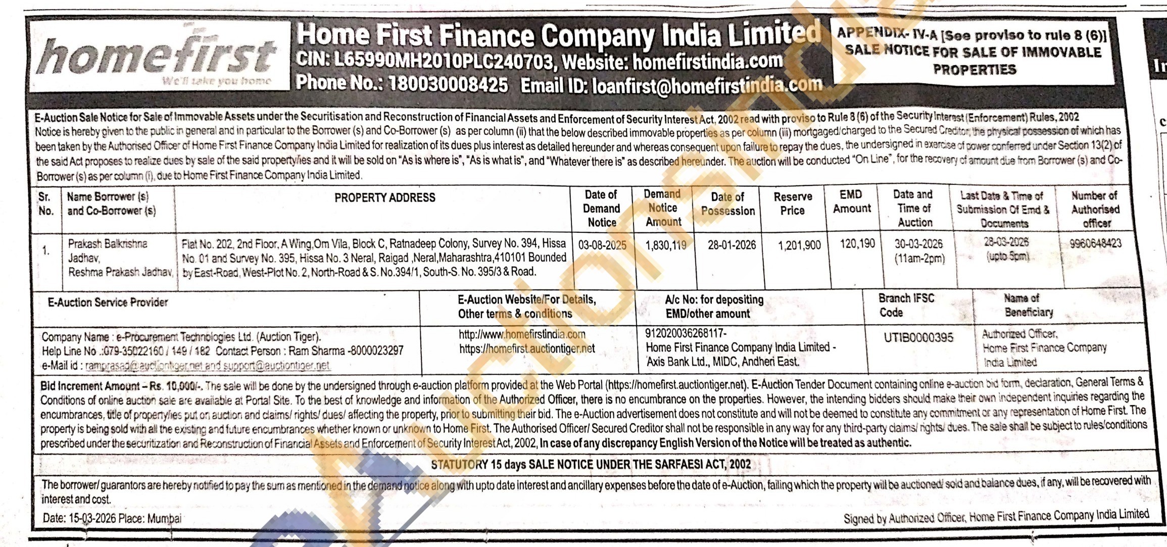 Flat No. 202, 2nd Floor, A Wing, Om Vila, Block C, Ratnadeep Colony, Survey No. 394, Hissa No 01 and Survey No. 395, Hissa No. 3 Neral, Raigad Neral, Maharashtra, 410101 Bounded East-Road, West-Plot No. 2. North-Road & S. No.394/1, South-S. No. 395/3 & Road