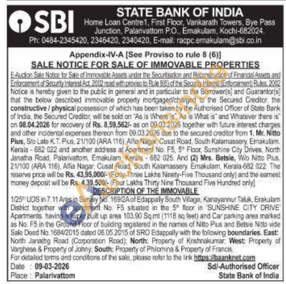 1/25 UDS in 7.11 Ares in Survey No. 169/2A of Edappally South Village, Kanayannur Taluk, Erakulam District together with apartment No. F5 situated in the 5th floor in 'SUNSHINE CITY DRIVE Apartments, having a super built up area 103.90 Sq.mt (1118 sq feet) and Car parking area marked as No. F5 in the Ground Floor of building registered in the names of Nitto Plus and Betsie Nitto vide Sale Deed No. 1684/2015 dated 06.05.2015 of SRO Edappally with the following boundaries. East: North Janathg Road (Corporation Road) North: Property of Krishnakumar, West: Property of Varghese & Property of Johny; South: Property of Philomina & Property of Francis