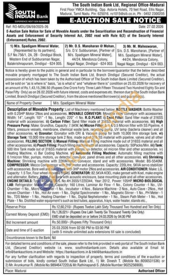 List of Machinery mentioned below: BOTTLE WASHER: Bottle Washer with 0.25HP Motor 2Nos and accessories. MOVABLE CONVEYOR: Movable roller conveyor with accessories. Width: 14", Length: 101-1 No., Length: 220-1 No. R.O.PLANT: i) Sand Filter: Sand filter made of 316SS material with accessories. ii) Carbon Filter: Sand filter made of 316SS material with accessories. iii) High Pressure Pump: Make: Grundfos, Capacity: 7.5KW, Iv) Micron Filter: 5, 1 & 0.5 Micron filter with SS Pipeline, 4 filters, pressure vessels, membrane, chemical waste tank, recycling pump, UV lamp (bacteria cleaner) and all other accessories. v) Ozonator: Ozonator with CRI & Vacuum pump for both 10,000 litre storage tank. vi) Storage Tank: 10,000 litre storage tank 2 Nos. made out of 316 SS material with pipeline, valves and all other accessories. FILLING SECTION: i) Manual Filling: Manual Filling machine made out of 316SS material and all other accessories. ii) Pouch Filling: Pouch filling machine with all accessories. Capacity: 50Packs/Min. iii) Tank: 500 litre Tank made out of 316SS material with pumps, uv detector, oil micron filter and other accessories. iv) Heating Machine. v) Bar Coding Machine. vi) Automatic Filling Machine: Automatic filling machine with 0.1micron filter, pumps, motors, uv detector, conveyor, panel drives and all other accessories. vii) Shrinking Machine: Shrinking machine with 22KWmotor, conveyor, stand and with accessories. Model: BS-5540M. COMPRESSOR: Mecco Compressor with 2HP motor and accessories. Capacity: 220Litre, SKVA servo stabilizer with accessories. Bore well and sump tank with 3HP motor 2Nos and accessories, AIR CONDITIONER: Make: LG, Capacity: 1.5 Ton, Four wheel movable trolley, GENERATOR: 82.5KVA KOEL make genset with Koel, make engine and alternator, Battery, Panel, Fuel tank with acoustic enclosure, base mounting plate and all other accessories. ENGINE DETAILS: Type: 4R1040 TA, S. No. 4H.3555/1220344, Year: 2012, Power: 105HP. MICRO-BIOLOGICAL LAB: Refrigerator: Make: Godrej. Capacity: 160 Litres, Laminar Air Flow -1 No., Colony Counter -1. No., UV-Chamber-1 No., Micro Controller-1 No., Incubator-4 Nos., Balance Machine-2 Nos, Auto Clave-2Nos., Hot woven Chamber-1 No., Hot Air oven-1 No., Digital Spectrometer-1 No., Magnetic Stirrer-1 No., PH Meter-1 No., TDS Meter-1 No., Heating Chamber-1 No., Digital Nephelometer-1 No., Steam Path Meter-1 No., Hot Plate-1 No. Distilled water equipment's such as test tubes, apparatus, trays, water heater, stands etc