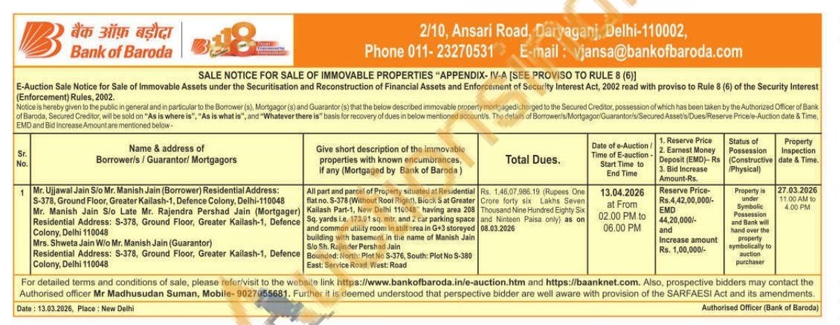 All part and parcel of Property situated at Residential flat no. S-378 (Without Roof Right), Block Sat Greater Kailash Part-1, New Delhi 110048 having area 208 Sq. yards i.e. 173.91 sq. mtr. and 2 car parking space and common utility room in stilt area in G+3 storeyed building with basement in the name of Manish Jain Sio Sh. Rajinder Pershad Jain Bounded: North: Plot No S-376, South: Plot No S-380 East: Service Road, West: Road