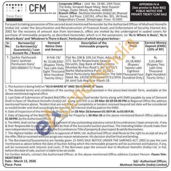 Flat No.108 & 109,1st Floor, Adm.325 & 371. Sq. Fts Respectively Swapna Shrushti, Opp Bank of Maharashtra Mumbai By-Pass Road S. No. 50/15/1 Narhe Maharashtra-Pune-411041. More Particularly Mentioned in The Sale Deed. No. 14159/2016 Dated 07/11/2016 At Joint Sub-Registrar Haveli-18