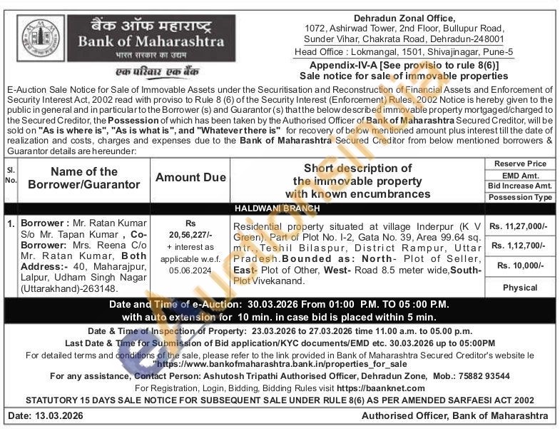 Residential property situated at village Inderpur (KV Green). Part of Plot No. 1-2, Gata No. 39, Area 99.64 sq. mtr., Teshil Bilaspur, District Rampur, Uttar Pradesh.Bounded as: North Plot of Seller, East- Plot of Other, West Road 8.5 meter wide, South-Plot Vivekanand.