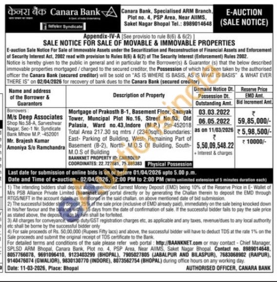 Mortgage of Prakosth B-1, Basement Floor, Samyak Tower, Muncipal Plot No.16, Street No.03, Old Palasia, Ward no.43, Indore (M.P.) Pin-452018 Total Area 217.30 sq mtrs/ (2340sqft) Boundaries: East- Parking of Building, West- Remaining Part of Basement (B-2), North- M.O.S Of Building, South-M.O.S of Building BAANKNET PROPERTY ID: CNRADEEP COORDINATES: 22.727881, 75.889383