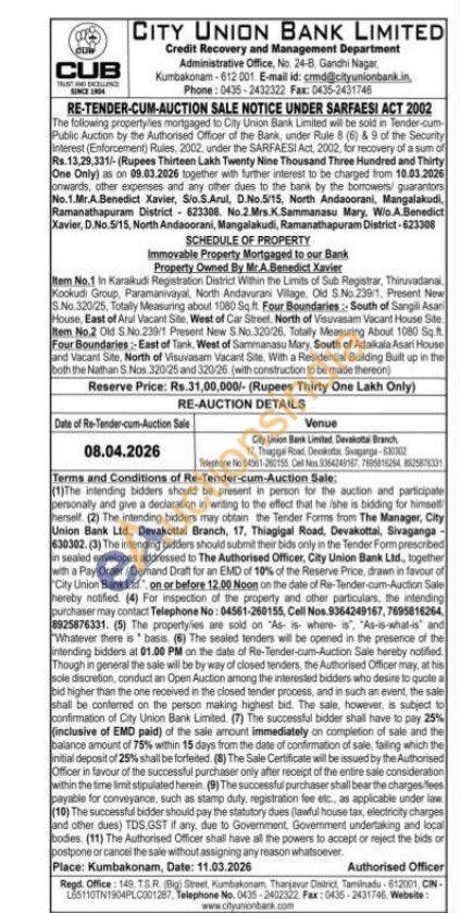 Item No.1 in Karaikudi Registration District Within the Limits of Sub Registrar, Thiruvadana Kookudi Group, Paramanivayal, North Andavurani Village, Old S.No.238/1, Present New S.No. 320:25, Totally Measuring about 1080 Sq.ft. Four Boundaries: South of Sangili Asan House, East of Arul Vacant Site, West of Car Street, North of Visuvasam Vacant House Site Item No.2 Old S. No.239/1 Present New S.No.320/26. Totally Measuring About 1080 Sq.ft. Four Boundaries: East of Tank, West of Sammanasu Mary, South of Adaikala Asari House and Vacant Site, North of Visuvasam Vacant Site, With a Residential Building Built up in the both the Nathan S. Nos 320/25 and 320/26. (with construction to be made thereon)