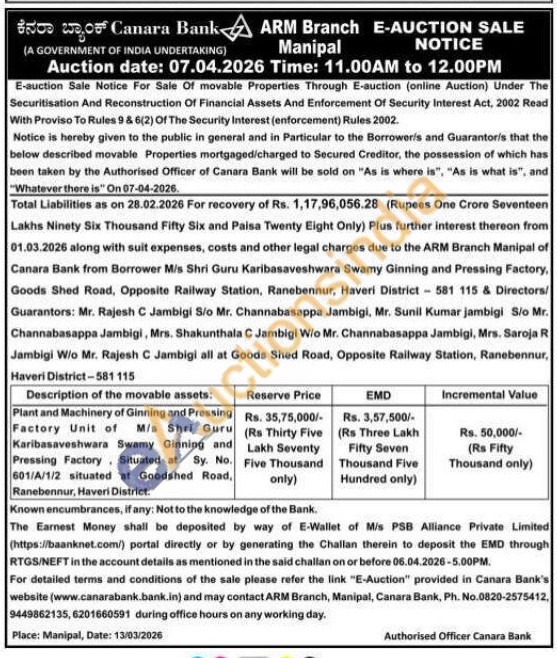 Plant and Machinery of Ginning and Pressing Factory Unit of M/s Shri Guru Karibasaveshwara Swamy Ginning and Pressing Factory Situated at Sy. No. 601/A/1/2 situated at Goodshed Road, Ranebennur, Haveri District.