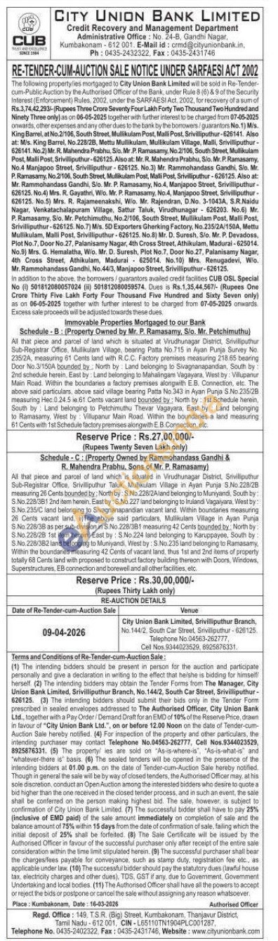 All that piece and parcel of land which is situated at Virudhunagar District, Srivilliputhur Sub-Registrar Office, Mullikulam Village, bearing Patta No.715 in Ayan Punja Survey No. 235/2A, measuring 61 Cents land with R.C.C. Factory premises measuring 218.65 bearing Door No.3/150A bounded by North by Land belonging to Sivagnanapandian, South by: 2nd schedule herein, East by: Land belonging to Mahalingam Vagayara, West by: Villupanur Main Road. Within the boundaries a factory premises alongwith E.B. Connection, etc. The above said particulars, above said village bearing Patta No.343 in Ayan Punja S.No.235/28 measuring Hec.0.24.5 ie.61 Cents vacant land bounded by: North by: 1st Schedule herein, South by Land belonging to Petchimuthu Thevar Vagayara, East by Land belonging to Ramasamy, West by: Villupanur Main Road. Within the boundaries a land measuring 61 Cents with 1st Schedule factory premises alongwith E.B Connection, etc.