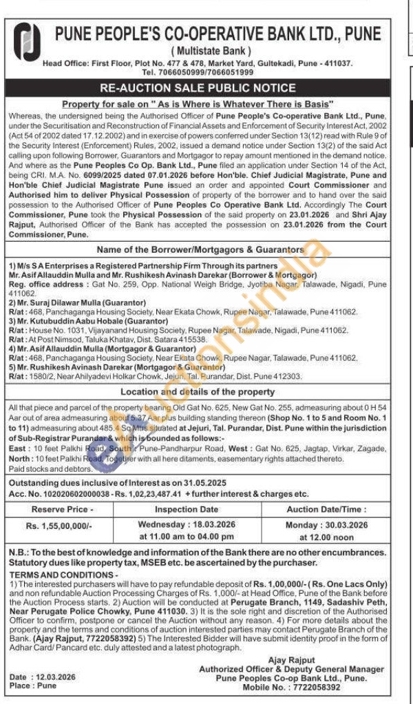 All that piece and parcel of the property bearing Old Gat No. 625, New Gat No. 255, admeasuring about 0 H 54 Aar out of area admeasuring about 5.37 Aar plus building standing thereon (Shop No. 1 to 5 and Room No. 1 to 11) admeasuring about 485.4 Sq Mirs situated at Jejuri, Tal. Purandar, Dist. Pune within the jurisdiction of Sub-Registrar Purandar & which is bounded as follows:- East: 10 feet Palkhi Road, South: Pune-Pandharpur Road, West: Gat No. 625, Jagtap, Virkar, Zagade, North: 10 feet Palkhi Road, Together with all here ditaments, easementary rights attached thereto. Paid stocks and debtors