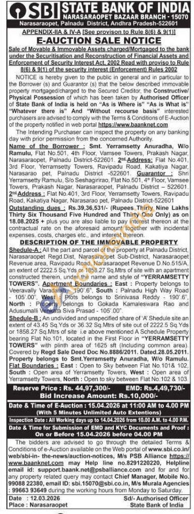 Narasaraopet Regd Dist, Narasaraopet Sub-District, Narasaraopet Revenue area, Ravipadu Road, Narasaraopet Revenue D. No.515/A, an extent of 2222.5 Sq. Yds or 1858.27 Sq.Mtrs of site with an apartment constructed therein, under the name and style of "YERRAMSETTY TOWERS". Apartment Boundaries: East: Property belongs to Veeravally Varadaiah 190.6", South Palnadu High Way Road 105.00", West: Plots belongs to Srinivasa Reddy 190.6" North Property belongs to Gokada Kamaleswara Rao and Adusumalli Venkata Siva Prasad-105.00"