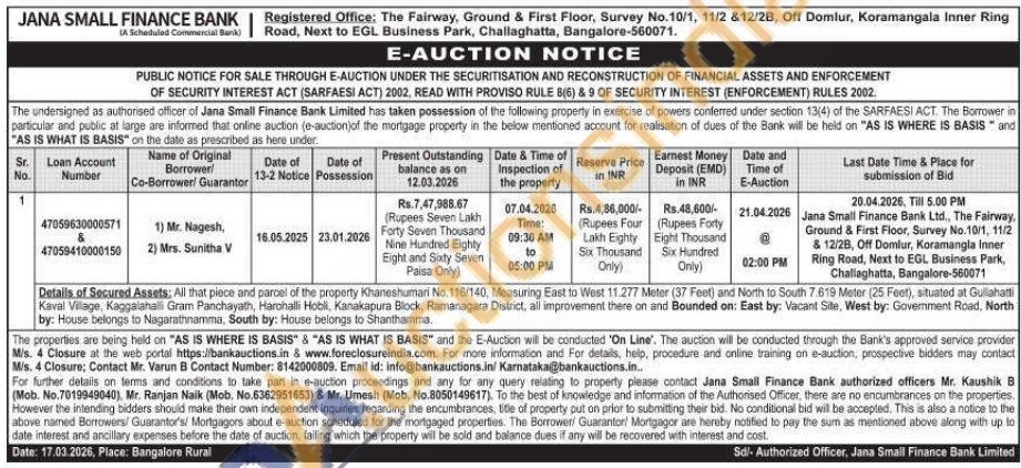 Details of Secured Assets: All that piece and parcel of the property Khaneshumari No. 116/140, Measuring East to West 11.277 Meter (37 Feet) and North to South 7.619 Meter (25 Feet), situated at Gullahatti Kaval Village, Kaggalahali Gram Panchayath, Harohalli Hobli, Kanakapura Block, Ramanagara District, all improvement there on and Bounded on: East by: Vacant Site, West by: Government Road, North by: House belongs to Nagarathnamma, South by: House belongs to Shanthamma.