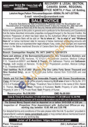 Details and Full Description of the Immovable Property with Known Encumbrances, If any. All that part and parcel of the property measuring 02.20 ares of land in Re Sy No. 377/21/2-3 of Kudappanakkunnu Village, Trivandrum Taluk & District in the name of Shri. Harish S. Thampi. Boundaries: West: Property of Kumaran, North: Property of John, South: Property of John CT & Privale Road, East: Property of Kumar.