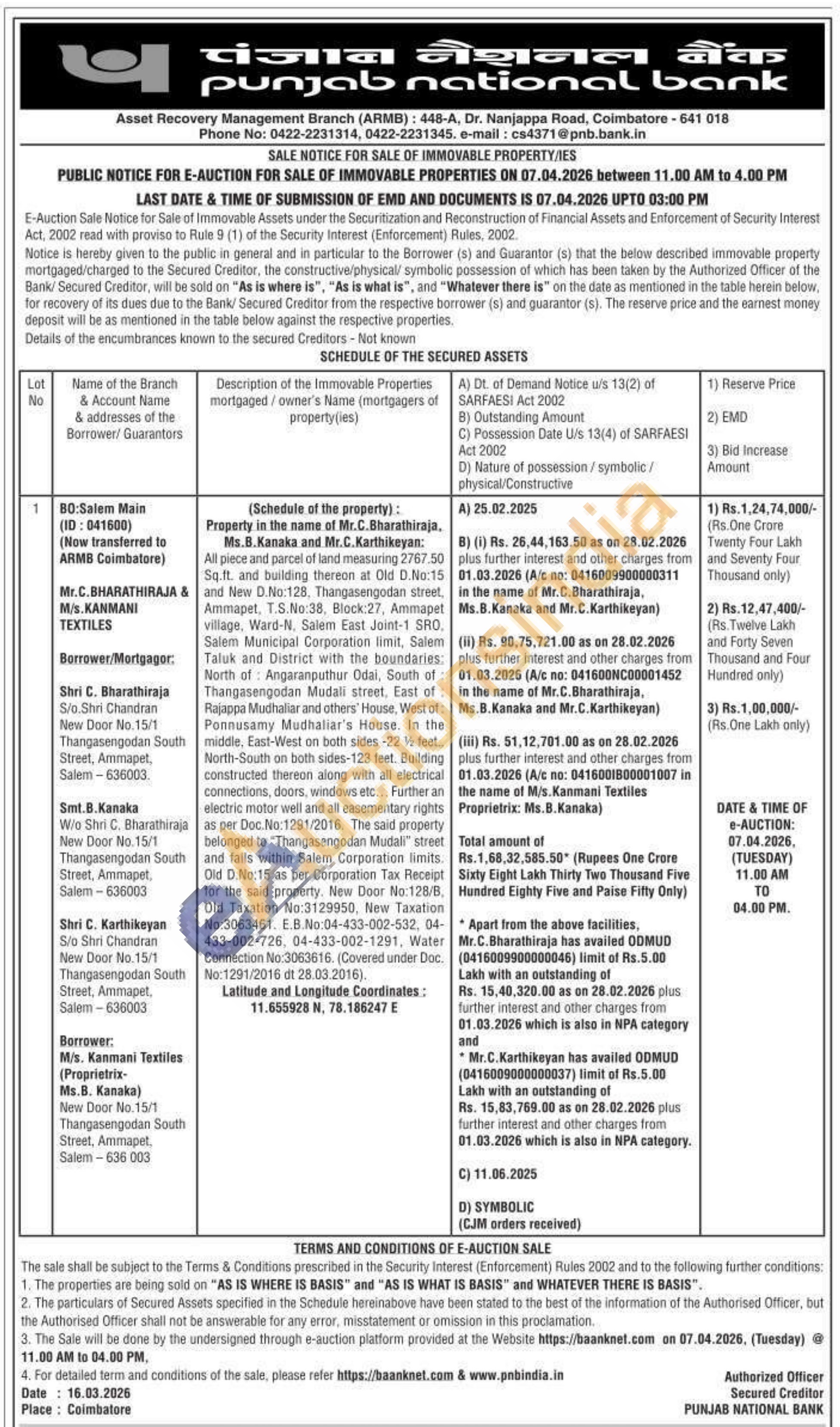 All piece and parcel of land measuring 2767.50 Sq.ft. and building thereon at Old D.No:15 and flew D.No:128, Thangasengodan street, Ammapet, T.S.No.38, Block:27, Ammapet village. Ward-N, Salem East Joint-1 SRO. Salem Municipal Corporation limit, Salem Taluk and District with the boundaries: North of Angaranputhur Odai, South of Thangasengodan Mudali street, East of Rajappa Mudhaliar and others' House, West of Ponnusamy Mudhaliar's House. In the middle, East-West on both sides -22 1½ feet, North-South on both sides-123 feet. Building constructed thereon along with all electrical connections, doors, windows etc... Further an electric motor well and all easementary rights as per Doc. No: 1291/2016. The said property. belonged to "Thangasengodan Mudali street and falls within Salem Corporation limits Old D.No:15 as per Corporation Tax Receipt for the said property. New Door No:128/8. Old Taxation No:3129950, New Taxation No:3063461. Ε.Β.No:04-433-002-532. 04-433-002-728, 04-433-002-1291, Water Connection No: 3063616. (Covered under Doc. No:1291/2016 dt 28.03.2016).