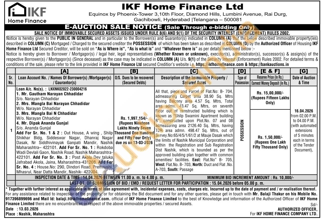All that, piece and Parcel of Flat. No: B-704, admeasuring Carpet area 38.90 Sq. Mtrs having Balcony area 4.57 Sq. Mtrs, Total area admn. 43.47 Sq. Mtrs, on seventh Floor out of constructed building which is known as "Shilp Swamini Apartment building B", constructed upon Plot.No. 07 and 08 admeasuring area 2126.40 Sq. Mtrs, having TDR area admn. 498.47 Sq. Mtrs, out of Survey. No:65/4/5/1/61/2 at Mauje Dasak which the limits of Nashik Municipal Corporation and within the Registration and Sub Registration Dist Nashik, which is bounded as per the approved building plan together with common amenities/ facilities. East: Flat. No" B- 705, West: Flat. No. B-703, North: Duct and Flat. No. A-703, South: Passage