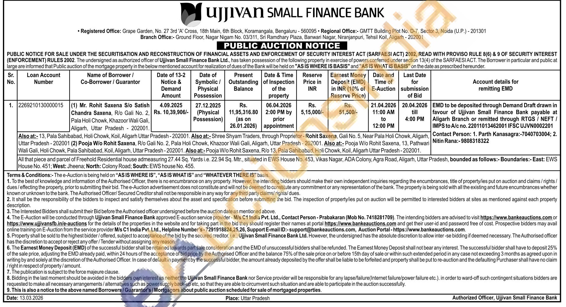 All that piece and parcel of Freehold Residential house admeasuring 27.44 Sq. Yards i.e. 22.94 Sq. Mtr., situated in EWS House No. 453, Vikas Nagar, ADA Colony, Agra Road, Aligarh, Uttar Pradesh, bounded as follows:- Boundaries:-East: EWS House No. 451; West: Jheena: North: Colony Road; South: EWS house No. 455.