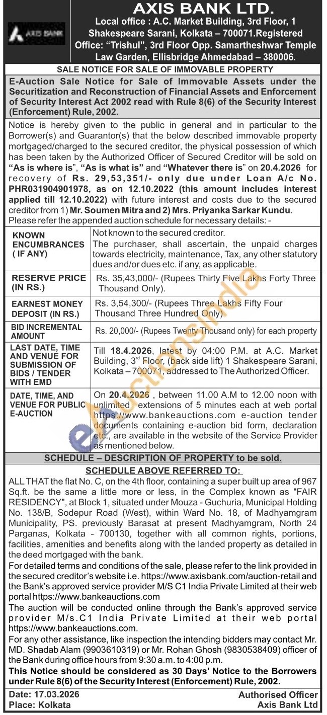 SCHEDULE ABOVE REFERRED TO: ALL THAT the flat No. C, on the 4th floor, containing a super built up area of 967 Sq.ft. be the same a little more or less, in the Complex known as "FAIR RESIDENCY", at Block 1, situated under Mouza - Guchuria, Municipal Holding No. 138/B, Sodepur Road (West), within Ward No. 18, of Madhyamgram Municipality, PS. previously Barasat at present Madhyamgram, North 24 Parganas, Kolkata 700130, together with all common rights, portions, facilities, amenities and benefits along with the landed property as detailed in the deed mortgaged with the bank