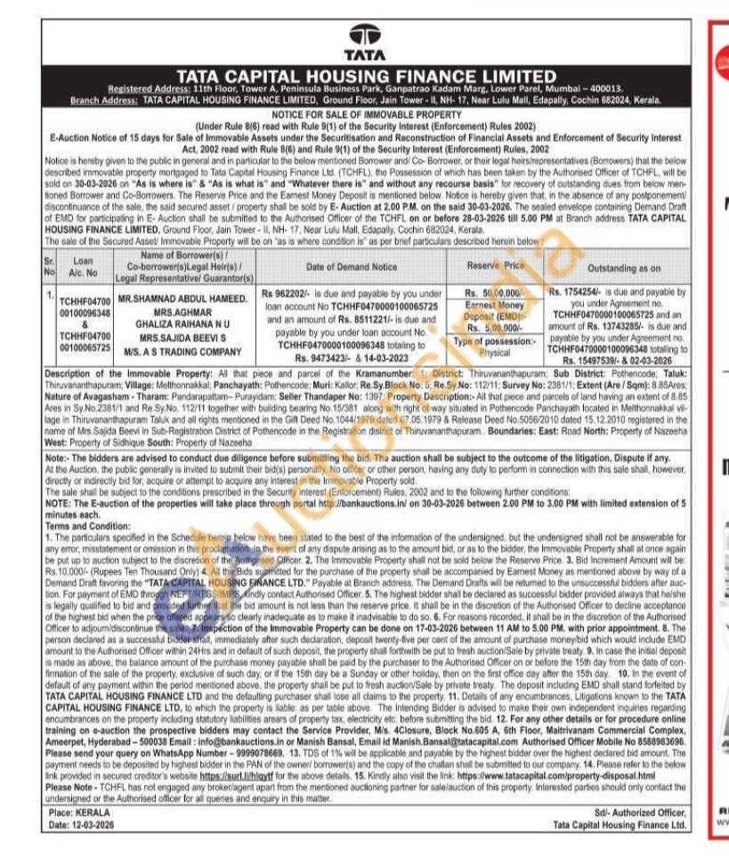 Description of the Immovable Property: All that piece and parcel of the Kramanumber: 1: District: Thiruvananthapuram: Sub District: Potherncode: Taluk: Thiruvananthapuram: Village: Melthonnakkal; Panchayath: Pothencode: Muri: Kallor, Re.Sy.Block No: 5; Re.Sy.No: 112/11: Survey No: 2381/1; Extent (Are/Sqm): 8.85Ares: Nature of Avagasham Tharam: Pandarapattam-Purayidam: Seller Thandaper No: 1397; Property Description:-All that piece and parcels of land having an extent of 8.85 Ares in Sy.No.2381/1 and Re Sy.No. 112/11 together with building bearing No.15/381 along with right of way situated in Pothencode Panchayath located in Melthonnakkal vii lage in Thiruvananthapuram Taluk and all rights mentioned in the Gift Deed No. 1044/1979 dated 07.05.1979 & Release Deed No 5056/2010 dated 15.12.2010 registered in the name of Mrs. Sajida Beevi in Sub-Registration District of Pothencode in the Registration district of Thiruvananthapuram.. Boundaries: East: Road North: Property of Nazeeha West: Property of Sidhique South: Property of Nazeeha