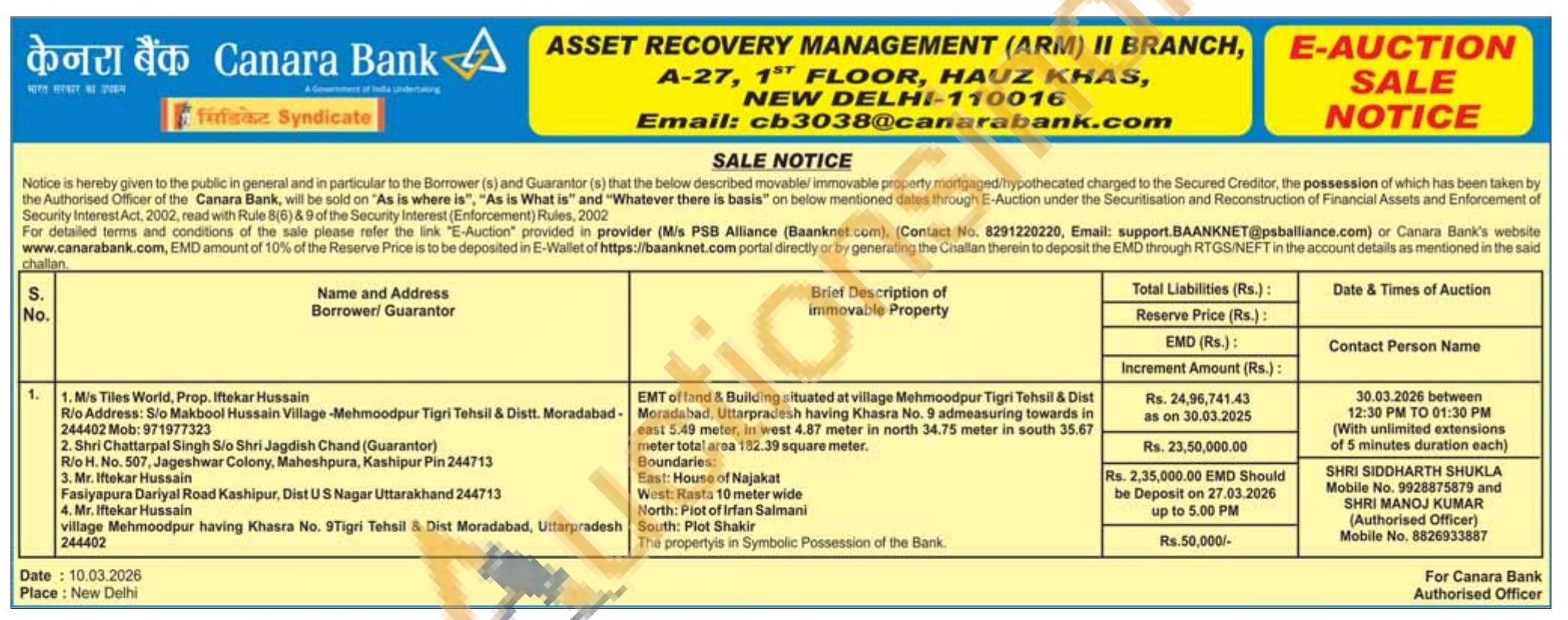 EMT of land & Building situated at village Mehmoodpur Tigri Tehsil & Dist Moradabad, Uttarpradesh having Khasra No. 9 admeasuring towards in east 5.49 meter, in west 4.87 meter in north 34.75 meter in south 35.67 meter total area 182.39 square meter.East: House of Najakat
