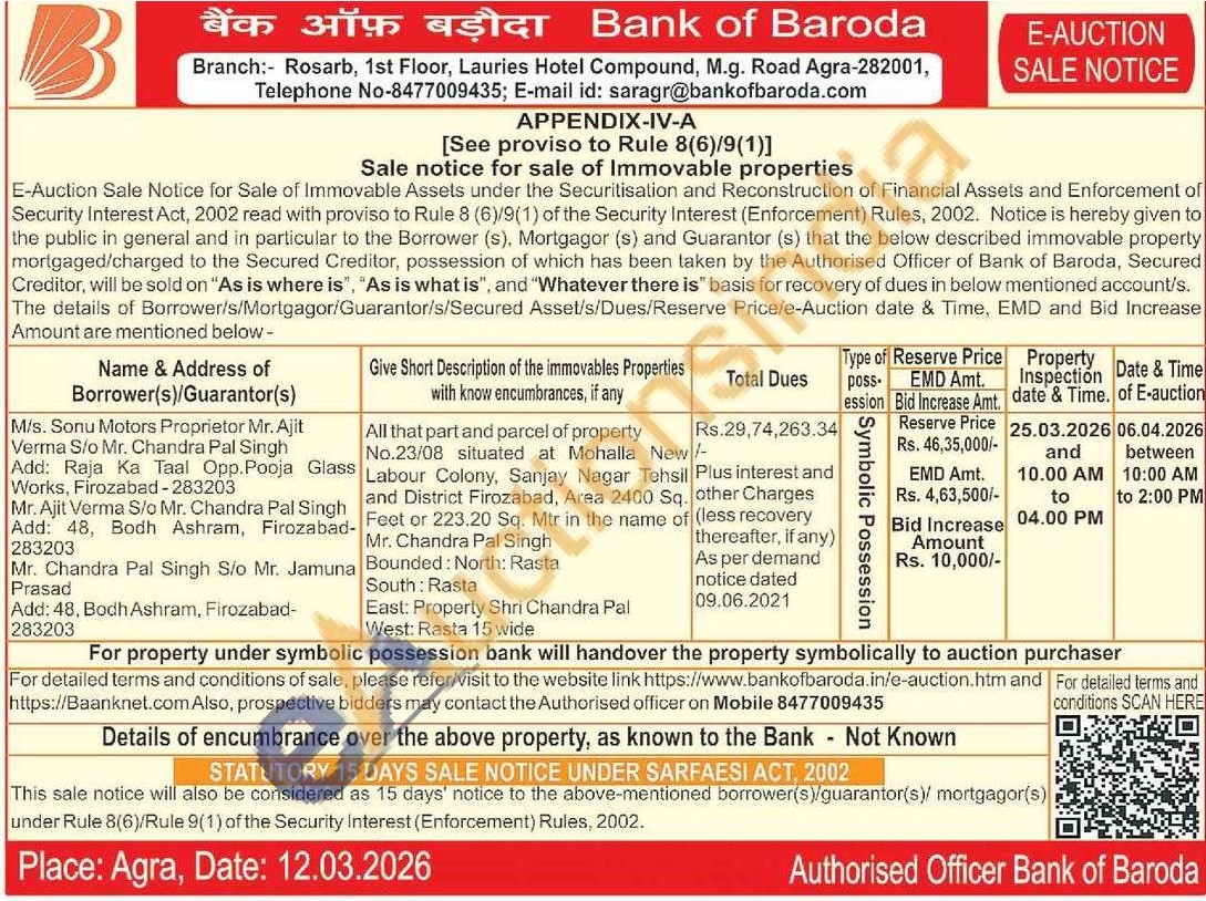 All that part and parcel of property No.23/08 situated at Mohalla New Labour Colony, Sanjay Nagar Tehsil and District Firozabad, Area 2400 Sq. Feet or 223.20 Sq. Mtr in the name of Mr. Chandra Pal Singh
