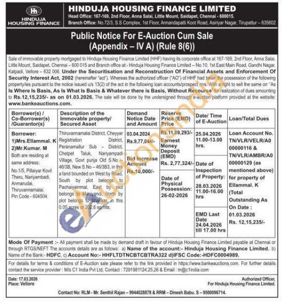 Thiruvannamala District, Cheyyar Registration District, Peranamallur Sub District Chetpet Taluk Nariyampadi Village, Govt punja Old S.No 46/38, New S.No-46/383, in this South by plot belongs to Pachaiyammal, East by plot belongs to Muniyandi, North by plot belongs to Shankar, in this 0.05 acres or 202.6 sq.mts. a land bounded on West by Road,