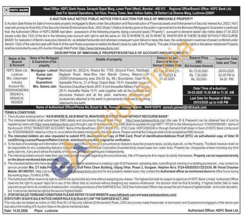 Municipal No. 20/22-A, Khasra No. 1759, (Ground Floor), Rambagh, Baghpat Road, Near-Shiv Hari Mandir Colony, Meerut, UP-250001(Admeasuring area 204.85 Sq. Mt.) Boundaries- East-76 Ft. thereafter Plot no. 31 of Roop Chand West-79 Ft. thereafter house of Ravindra Chaudhary North-28 Ft. 6 Inch thereafter Military Farm South-28 Ft. thereafter Rasta 15 Ft. wide together with all the buildings and structures thereon and all the plant, machinery, equipment and accessories attached to the earth or permanently fastened to anything attached to the earth,