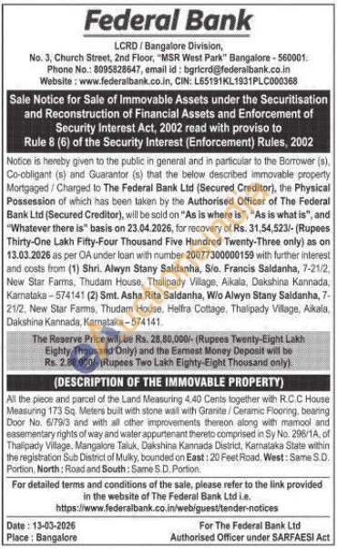 All the piece and parcel of the Land Measuring 4.40 Cents together with R.C.C. House Measuring 173 Sq. Meters built with stone wall with Granite/Ceramic Flooring, bearing Door No. 6/79/3 and with all other improvements thereon along with mamool and easementary rights of way and water appurtenant thereto comprised in Sy No. 296/1A, of Thalipady Village, Mangalore Taluk, Dakshina Kannada District, Karnataka State within the registration Sub District of Mulky, bounded on East: 20 Feet Road. West: Same S.D. Portion, North: Road and South: Same S.D. Portion