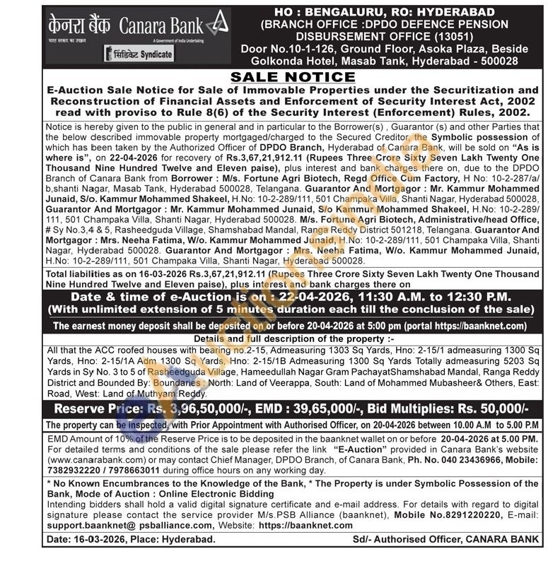 All that the ACC roofed houses with bearing no.2-15, Admeasuring 1303 Sq Yards, Hno: 2-15/1 admeasuring 1300 Sq Yards, Hno: 2-15/1A Adm 1300 Sq Yards, Hno: 2-15/1B Admeasuring 1300 Sq Yards Totally admeasuring 5203 Sq Yards in Sy No. 3 to 5 of Rasheedguda Village, Hameedullah Nagar Gram Pachayat Shamshabad Mandal, Ranga Reddy District and Bounded By: Boundaries: North: Land of Veerappa, South: Land of Mohammed Mubasheer& Others, East: Road, West: Land of Muthyam Reddy.