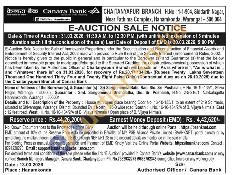 Details and full Description of the Property: House with open place bearing Door No. 16-10-135/1, to an extent of 219 Sq Yards, situated at Shivanagar, Warangal District. Bounded By: North: 25-0 wide road, South: H.No. 16-10-134/2/A of B. Vijaya Nirmala, East : 12 feet road, West: H.No. 16-10-134/2/A of B. Vijaya Nirmala / Open place of B. Vijaya Nirmala