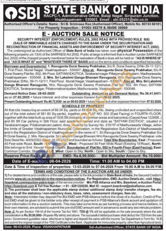 All that site measuring an extent of 59.34 Sq. yards or 49.608 Sq. mts (being undivided and unspecified share out of the total extent of 581.80 Sq yards), together with FLAT NO. 502 (East Facing) in FOURTH FLOOR, together with the total built up area of 1535 Sft (inclusive of common areas and balconies) (Carpet Area 1228Sft.,) and 80 Sft Car parking in Stilt Floor, said apartment named and style as "SATYAM EXOTICA", situated in Tarakaramnagar, Pillakomativani palem, Area, covered by Survey No. 315/1P of Madhurawada Village, within the limits of Greater Visakhapatnam Municipal Corporation, in the Registration Sub-District of Madhurawada and in the Registration District of Visakhapatnam in the name of 1. Sri Ravugunta Dorai Swamy Prabhakar S/o R Doral Swamy. 2. Mrs. Ravugunta Sri Lakshmi Ganga Bhavani W/o Ravugunta Dorai Swamy Prabhakar, vide Sale Deed No. 4005/2022 dated: 16.05.2022 and bounded as follows: Total Site Boundaries: East: Proposed 40 Feet wide Road, South: 6'6" feet gorge, West: Proposed 30 Feet Wide Road (Existing 15'Road), North: Site belongs to Smt. Yavvari Yojana Gandhi. Boundaries of Flat No. 502 in Fourth Floor (East Facing): East: Common Corridor, Staircase & Lift, West: Open to Sky, North: Open to Sky, South: Open to Sky.