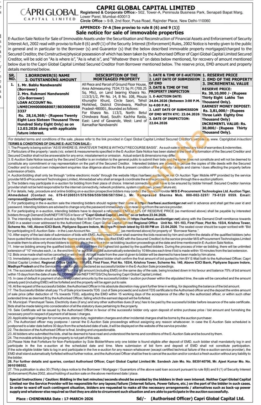 All Piece and Parcel of Ground Floor House, Area Admeasuring 7534.73 Sq Ft (700.25 Sq. Mts), on Land bearing Khasra No. 113/3/1/2, PH No. 14, B. No. 108, Mouza Khunajhir Khurd, Circle Saori, Tehsil Mohkhed, District Chindwara, Madhya Pradesh 480001, Bounded as follows: Chindwara For Khasra No. 113/3, North: Betul wara Road, South: Kachha Rasta, East: Land of Gawande, West: Land of Ramadhar Nandwanshi